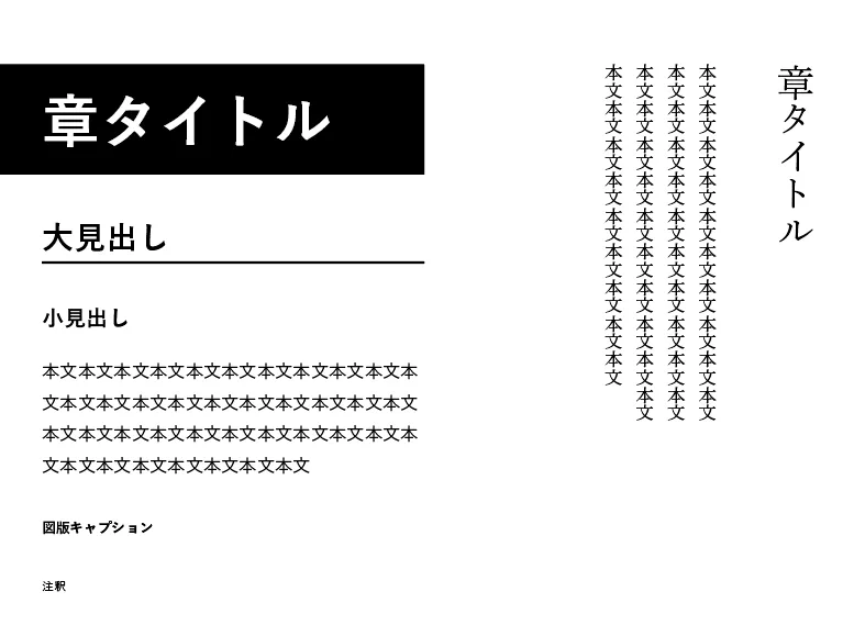 モノクロ印刷では、フォントの選定がデザインのクオリティを大きく左右します。異なるフォントやフォントサイズを使い分けて、ページに動きを与えたり、重要なポイントを強調したりすることができます。無線綴じ冊子のような多ページの印刷物では、フォントスタイルを統一しつつ、見出しや本文に変化をつけることで、ページ全体が読みやすくなります。