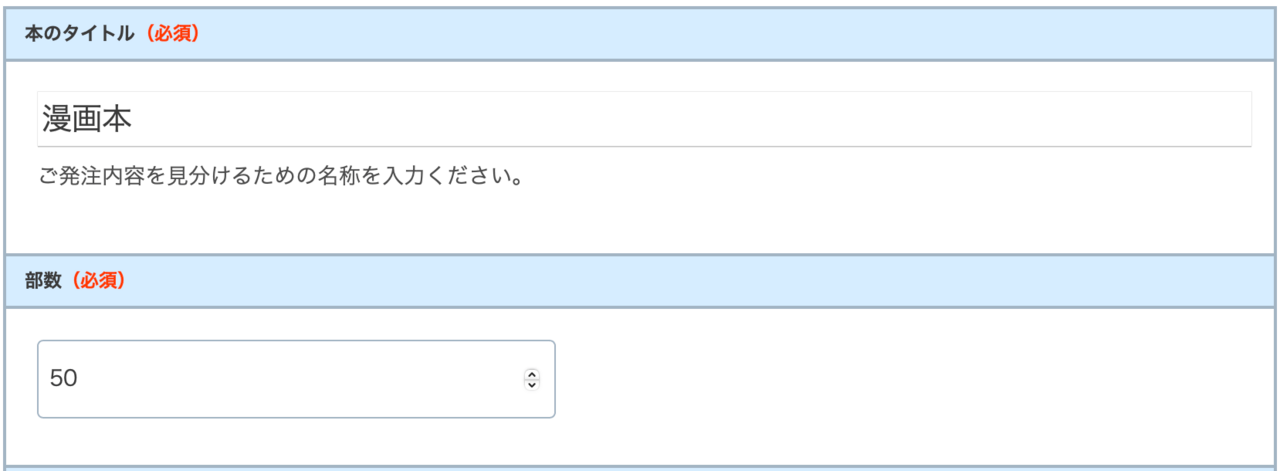 印刷する漫画のタイトルと部数を入力してください。タイトルは、実際の書名である必要はありません。
