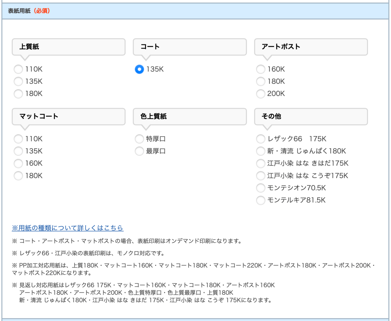 表紙のPP加工を追加する場合は「アートポスト180K」以上、「マットコート160K」以上、「マットポスト 220K」の中から選択してください。