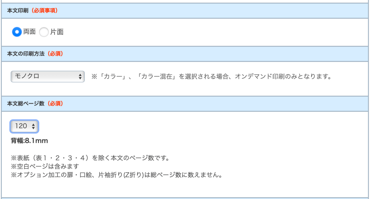 ここでは「両面」「モノクロ」「120ページ」を選択しました。必要に応じて入力してください。