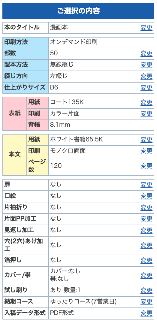 ページ右側に一覧表示されている、選択した印刷製本の仕様は変更が可能です。