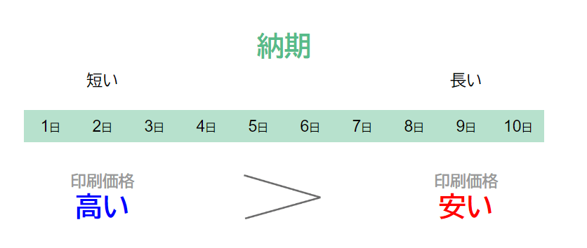納期が短いと印刷価格は高くなり、納期が長いと印刷価格は安くなります。印刷物の注文内容が同じでも、納期が長い方が印刷価格は安くなります。