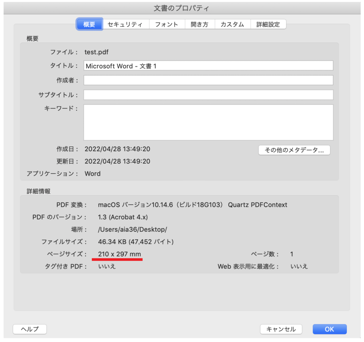 PDFしか残っていない場合は、Acrobatで「プロパティ」を開くと書類サイズが確認できます。