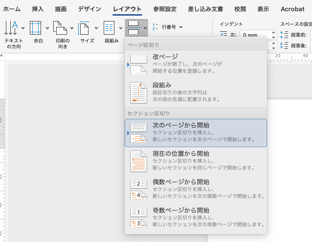 まず、余白を変えたいページの前にカーソルを置いて「レイアウト」タブで「次のページから開始」を選びます。