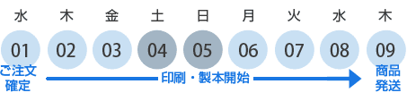 ※発送予定日は目安です。ご注文はお早めに、余裕をもってお願い致します。 ※実際のご入稿が正午を過ぎている場合は翌日扱いとなります。 ※データに不備または支払い完了となっていない場合は発送日が遅れます。 ※オプションなどによる追加納期について