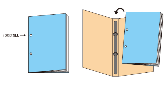 冊子の綴じ側にパンチ穴を開ける加工です。 バインダーやファイルの標準的な綴じ位置に合った間隔80mmの穴あけ加工です。 ファイリングして整理・保存する教材やセミナーのテキスト、資料に適しています。