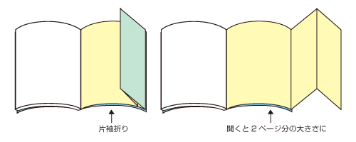 地図や年表、工程表など、大きな図版を途切れなく見せたい場合に効果的です。 また、他ページとの差別化を図れるので、特別な寄稿文や写真、名簿などを片袖折りにするのもいいでしょう。