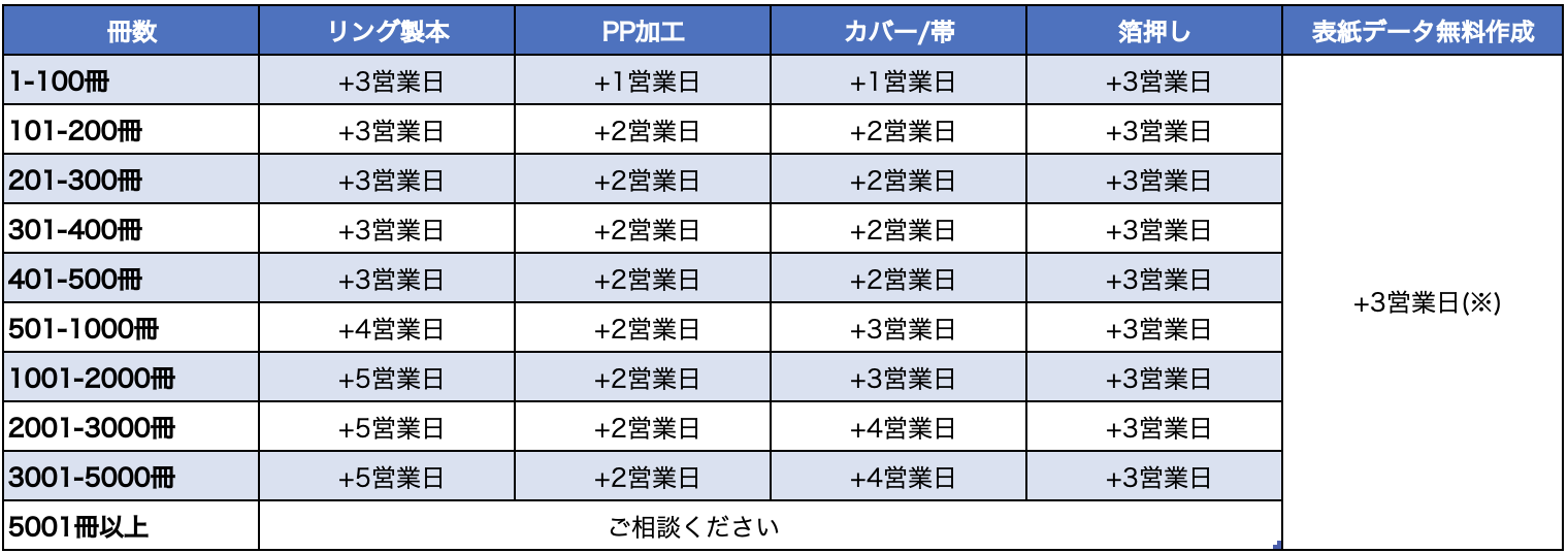 ・ 1~100冊 +1営業日 ・ 101~500冊 +2営業日 ・ 501~2000冊 +3営業日 ・ 2001~5000冊 +4営業日